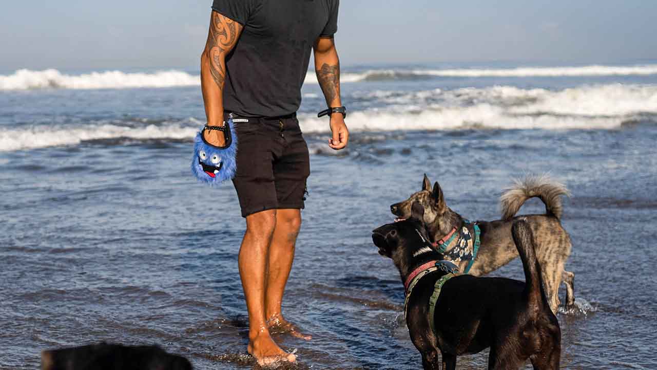 Chewy the dog treat pouch from Tequila&Bones with dogs on a beach